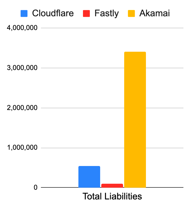 The profit margin for Akamai stands out as the only positive one, since they’re the only profitable company of the bunch. Cloudflare and Akamai both have a higher degree of leverage because they’ve both raised money by issuing convertible debt, while Fastly only has minor obligations like unpaid invoices and wages.
