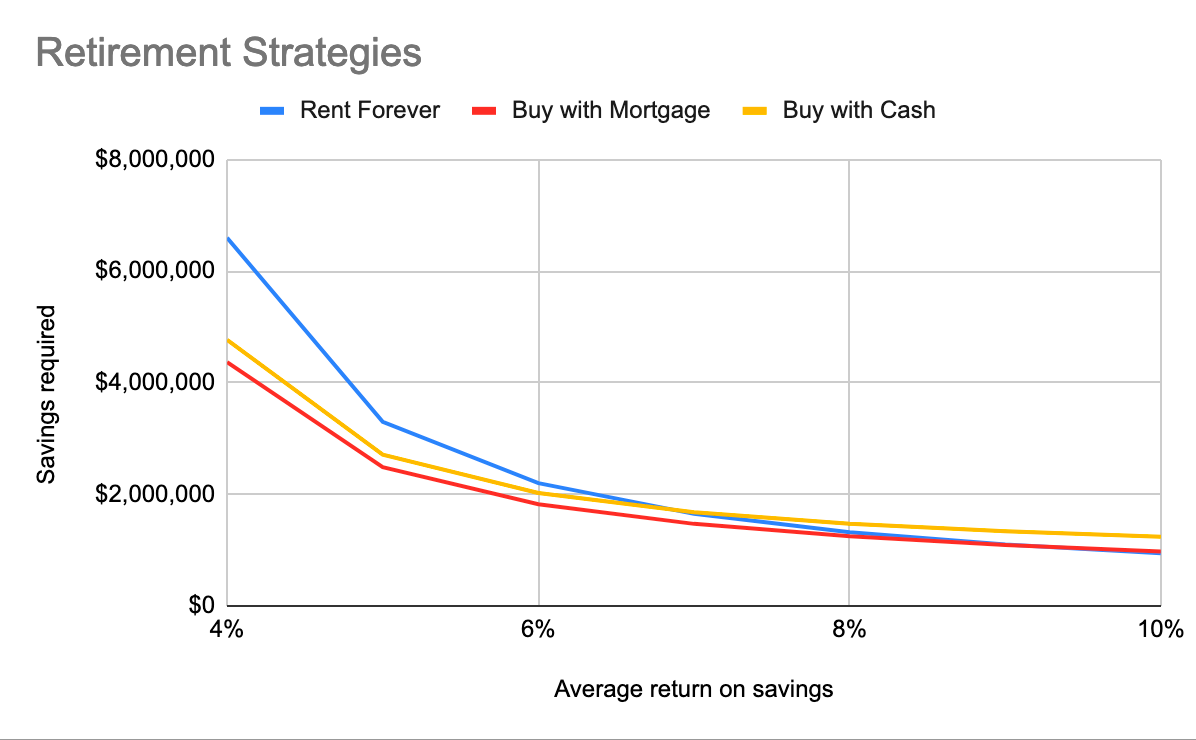 The approach I took was to calculate the price of a perpetuity that would pay my rent, bills, food, and shopping expenses assuming a modest degree of inflation. I compared this to the strategy where I buy a house with a mortgage with 20% down, purchase a 30-year annuity that pays the mortgage, and a separate perpetuity that pays for bills, food, shopping, property tax, HOA, and repairs. I also checked a third approach, which is to buy a house with cash directly instead of using a mortgage.