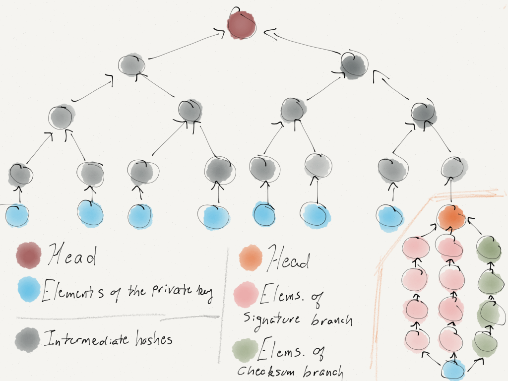 Above is the anatomy of a trustee's secret key in this construction. All of the blue elements (besides the one on the far right) represent the trustee's normalized attributes. The blue element on the far right represents a random string chosen by the attribute-issuing authority. The arrows, showing the application of a one-way function, describe the generation of a Merkle tree where the right-most leaf node is the head of a MW-chain. The head of the Merkle tree in its entirety is then the commitment from which the one-time signature and all the attributes the trustee wishes to prove are verified.